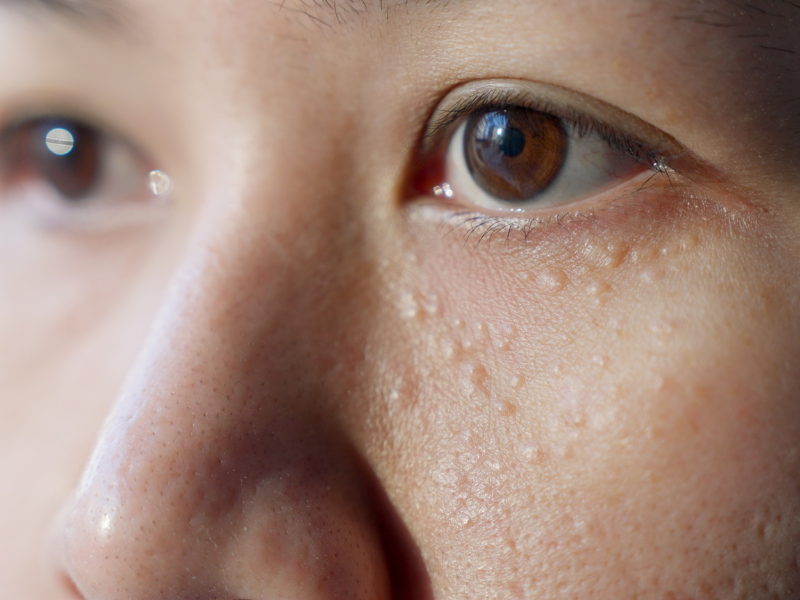 I siringomi sono piccole lesioni cutanee benigne originate dalle ghiandole sudoripare eccrine. Si presentano come piccoli papuli (rilievi) di colore della pelle o leggermente giallastri, spesso localizzati intorno agli occhi, sulle guance o sul collo.